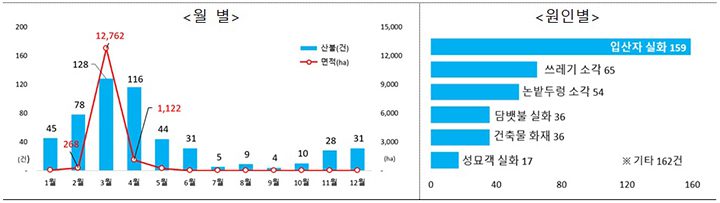 최근 10년간 산불은 3월과 4월에 집중적으로 발생했다. 특히 입산자 실수가 가장 큰 원인이며, 쓰레기 소각과 논밭두렁 소각이 그 뒤를 잇는다. 산불을 예방하기 위한 핵심 수칙은 간단하다. 산에 갈 때는 라이터나 성냥 같은 화기를 가져가지 않는다. 취사와 야영은 반드시 허가된 구역에서만 해야 한다.