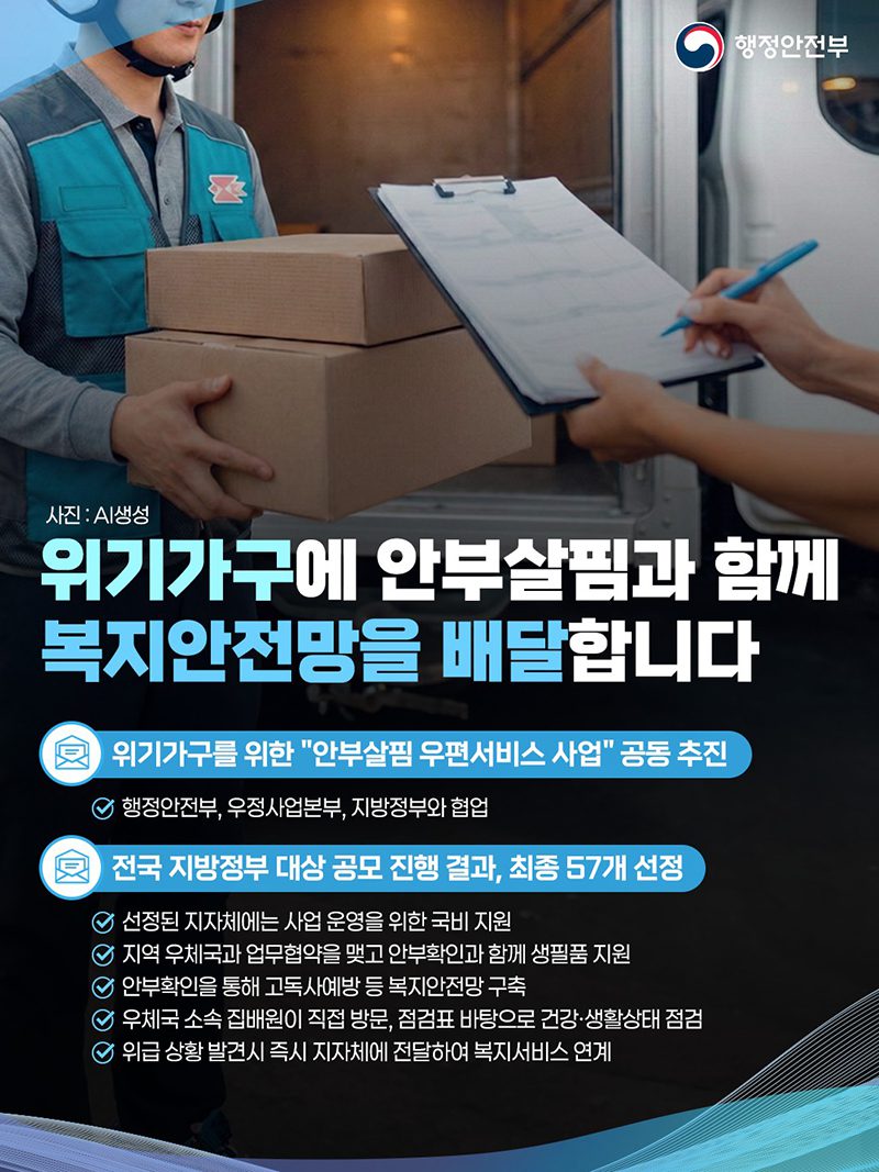 행정안전부와 우정사업본부, 지방정부는 ‘안부살핌 우편서비스’ 사업을 공동으로 추진한다. 이 사업은 전국 57개 지방정부에서 우선 시행된다. 지역 사정에 밝은 집배원이 독거노인 등 도움이 필요한 가구를 정기적으로 방문하는 것이 핵심이다.