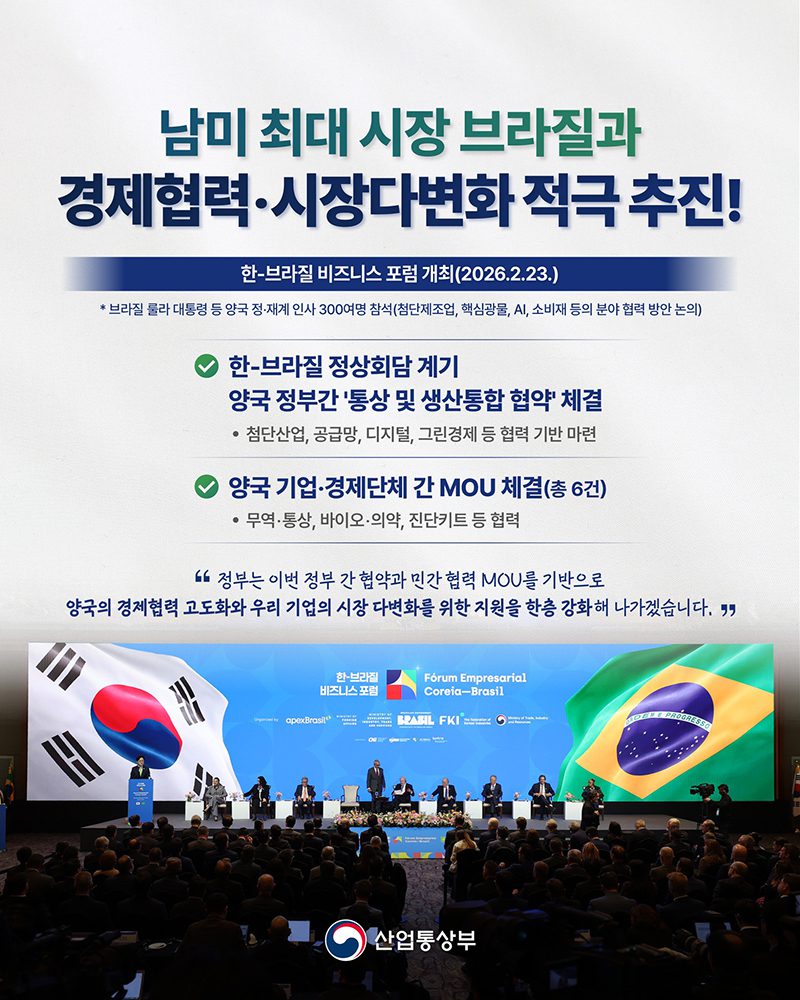정부는 이번 협약을 발판 삼아 우리 기업의 시장 다변화를 위한 지원을 더욱 강화할 방침이다. 이에 따라 브라질 시장을 겨냥한 새로운 사업 기회가 계속해서 늘어날 것이다.