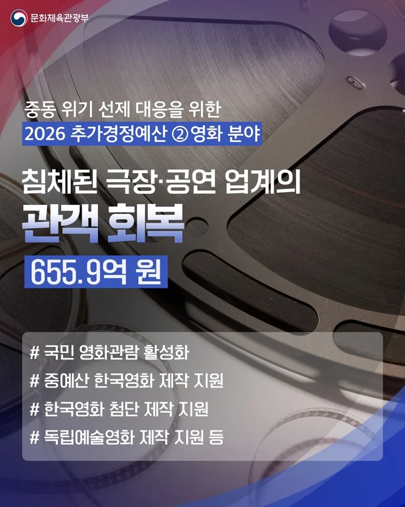 중동 위기 선제 대응을 위한 2026년 추가경정예산이 영화 분야에 655.9억 원을 배정했다. 이 예산은 침체된 극장·공연 업계의 관객 회복을 목표로 한다.