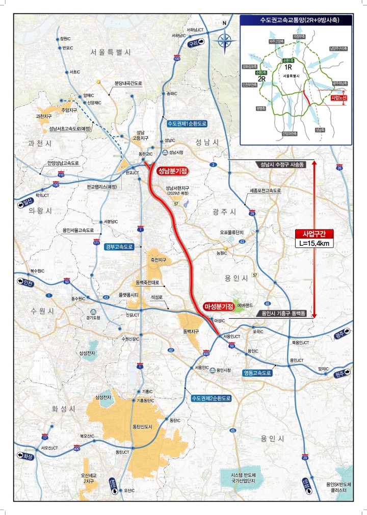국토교통부는 용인-성남 민자고속도로 사업이 한국개발연구원의 민자적격성조사를 통과했다고 밝혔다. 이 사업은 용인시 동백동에서 성남시 사송동까지 총 15km를 연결하는 고속도로를 건설하는 것이다. 수도권 제1순환선과 제2순환선을 잇는 새로운 도로가 생긴다.