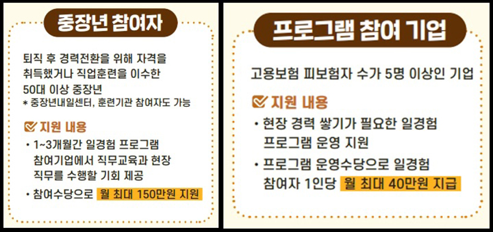 지원 대상은 사무직 등 주된 일자리에서 퇴직한 50대 중장년이다. 새로운 분야로의 재취업을 위해 자격증을 취득했거나 관련 직업훈련을 이수한 사람이 신청할 수 있다. 선발된 참여자는 1개월에서 최대 3개월간 기업에서 실무를 경험하며 새로운 직무에 적응하게 된다. 이 기간 동안 전담 멘토의 지도는 물론 기초 실무교육도 함께 제공된다.